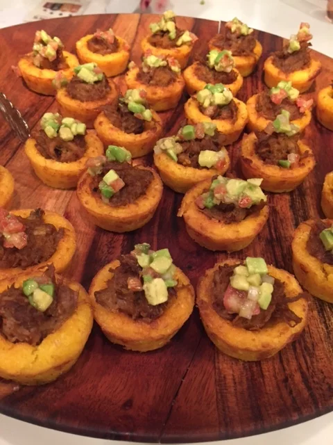 Mini BBQ Pork Buns and BBQ Chicken in Masa cups with avocado relish.