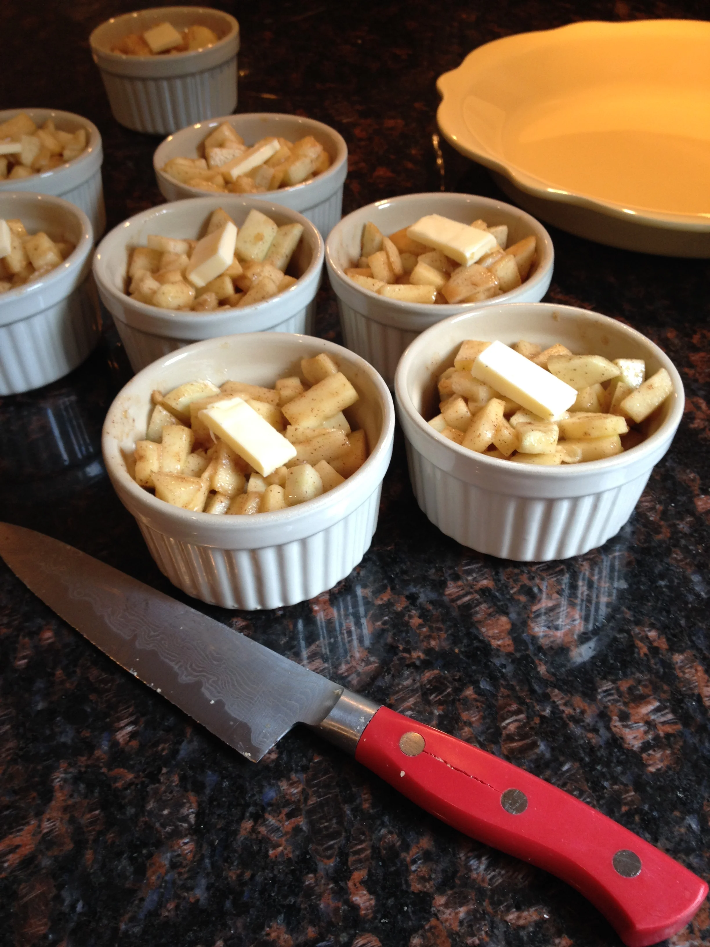 Below is my New England family recipe that has been made since I can remember and all I did differently for the mini apple pies was to dice my apples a little smaller and I needed to buy a couple of packages of pie crusts so that I could cut out circles to place on top of the filling, once it was in the ramekin.