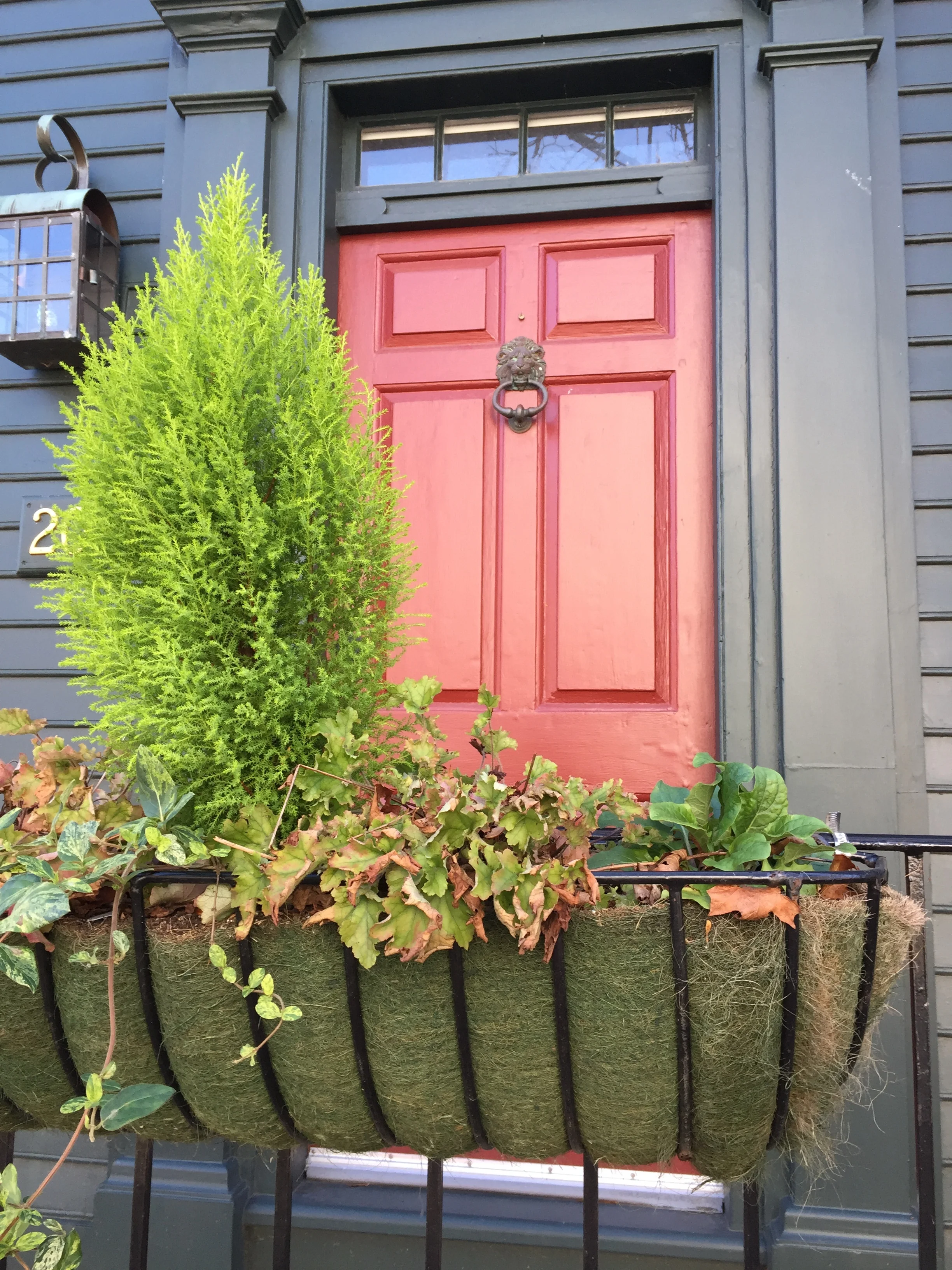 One of my children's favorite books when they were little was called "Loud as a Lion". They liked knowing the simple roar of the a lion was enough to scare away enemies. It is no different with lion head door knockers. Not only are they functional, but it looks as if it is guarding its territory and fearlessly protecting the home. This New England home, with its pumpkin colored door, is in Newport, Rhode Island.