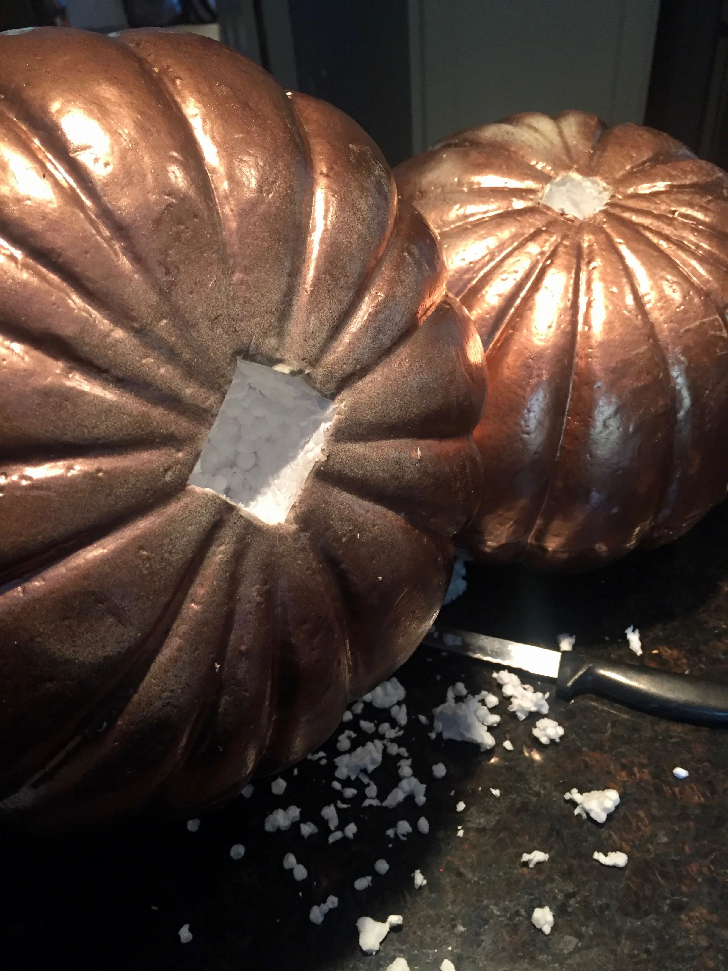 Before I show you the few steps that I actually remembered to photograph while spray painting, below are a few old photos of what the pumpkins looked like before I painted them metallic. I found all of my pumpkins at a local Christmas Tree Shop, but they can be found at many craft and home stores.