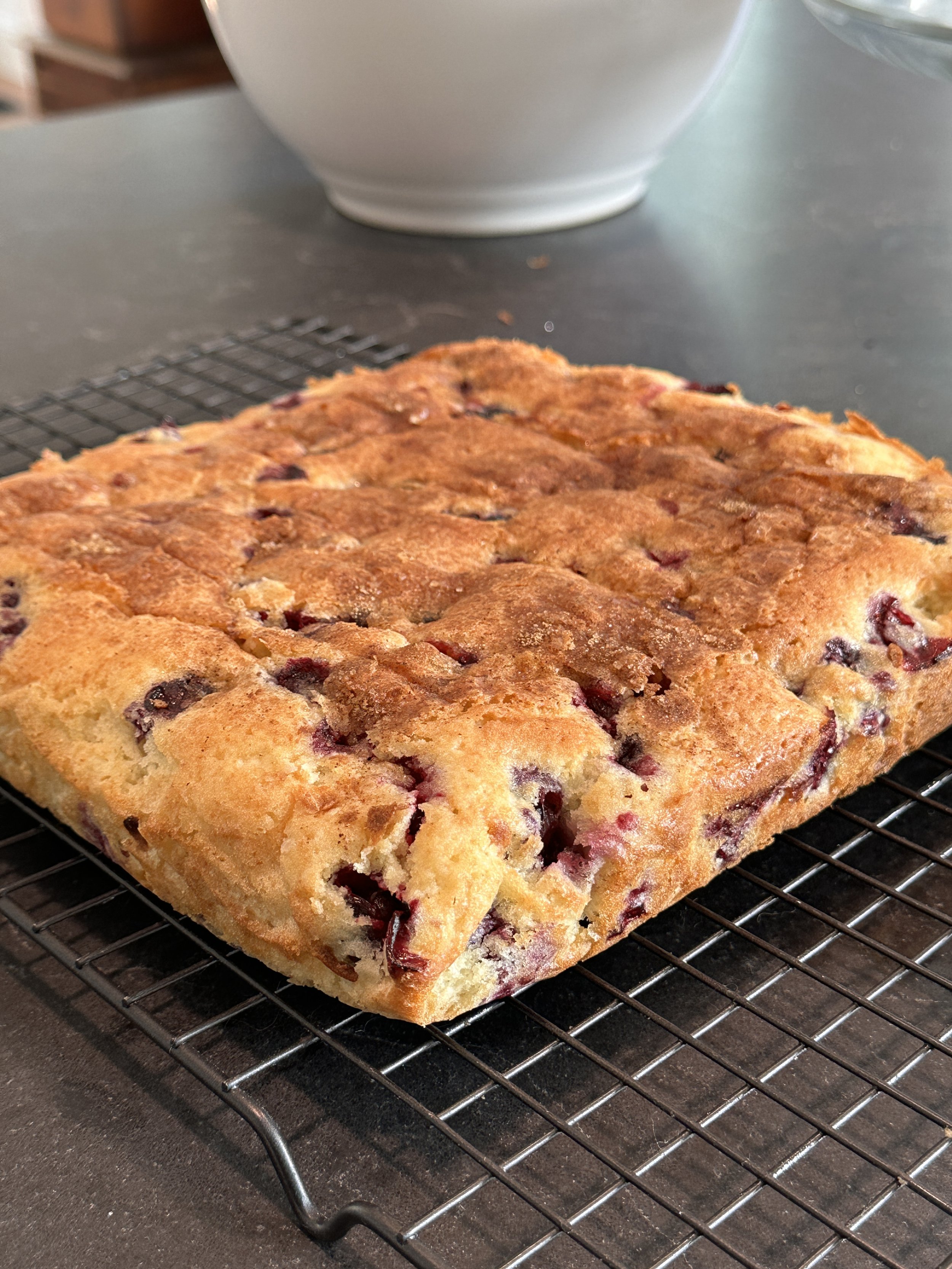 Last week I shared the recipe for Jordan Marsh Blueberry Muffins and today I’m pleased to share Ben’s Great Grandmother’s recipe for blueberry cake. How could I not make it? He asked his sister to send him the recipe, went to our little side-yard orchard to pick more blueberries, then put both the basket of blueberries and the printed out recipe on the counter. Hint gladly taken.