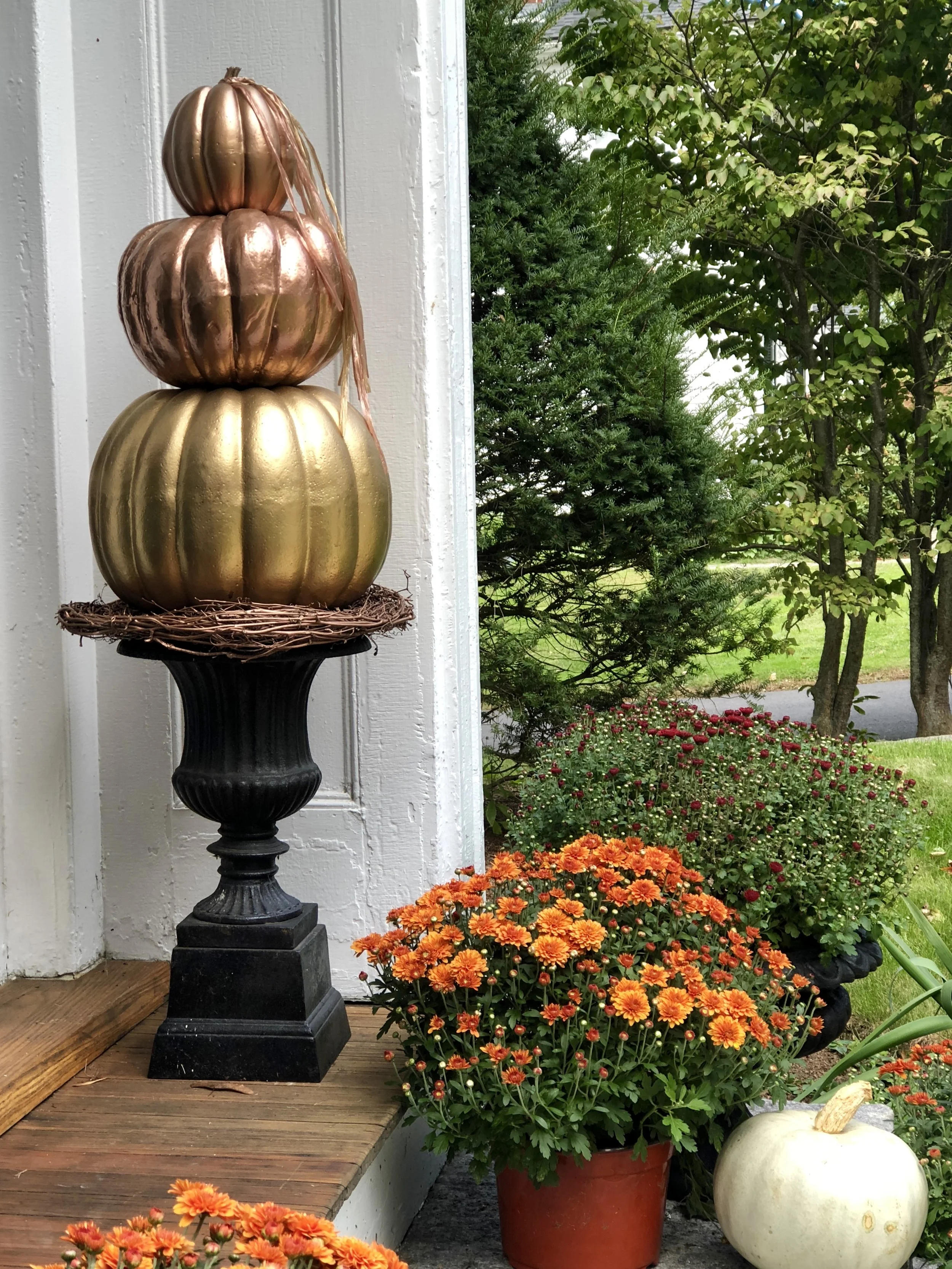 When I posted my most recent photos of these New England style fall pumpkin topiaries, I only had two showing since I thought the three I had made for our previous home would overwhelm the portico, but once I added the mums, the three worked perfectly.