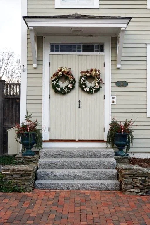 Modern silver Christmas accents flank the doors of this antique home in Portsmouth, NH