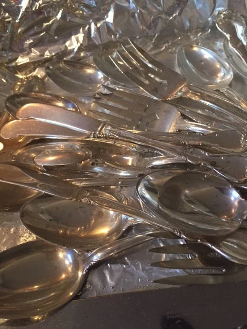 Call me lazy, but for years I have been cleaning my silver flatware with this easy cleaning process when I am out of store-bought silver polish or when I have a lot to clean. Not only is it easy, but it works wonders on pieces with intricate detail.