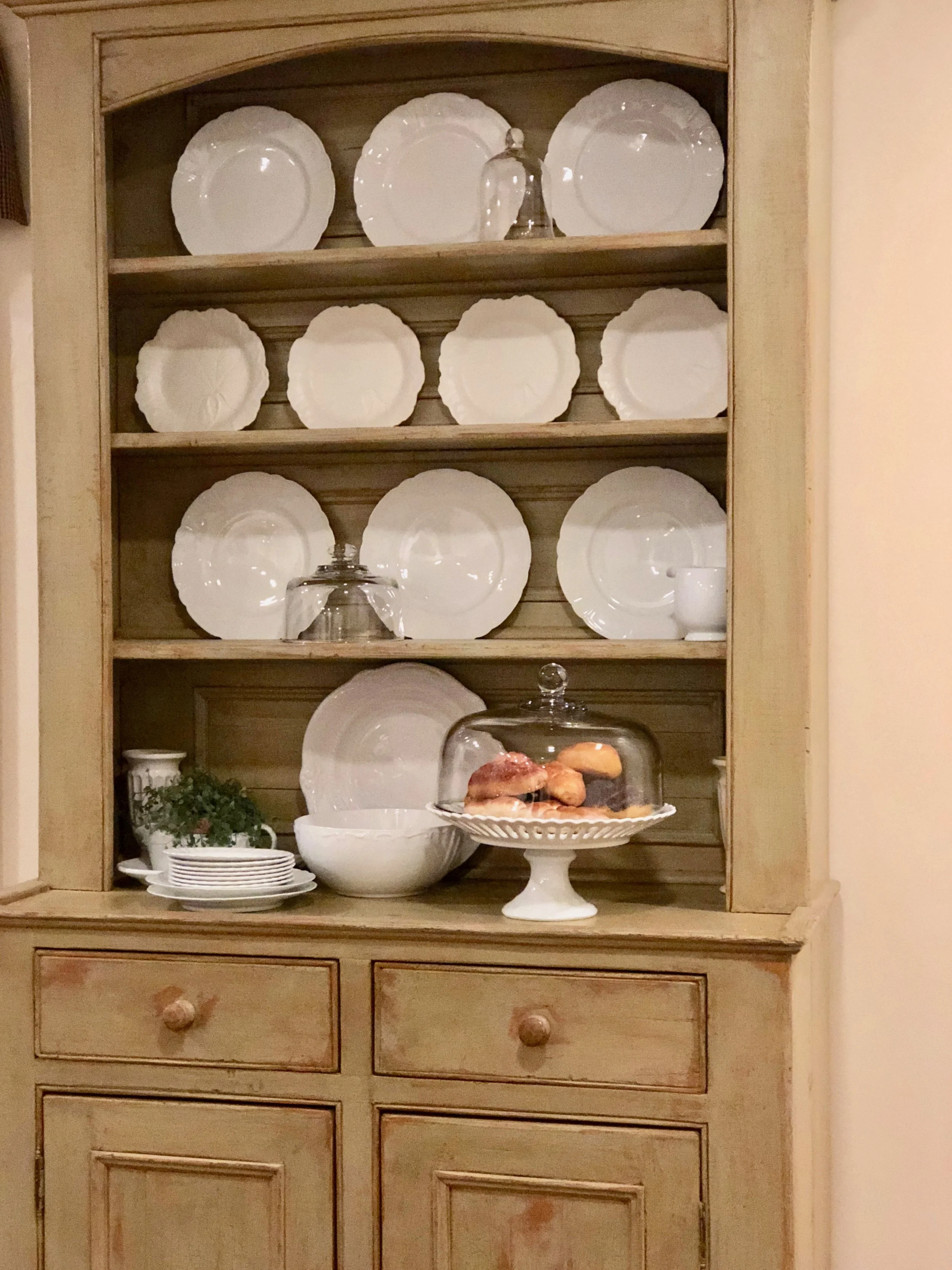 Once the pine hutch was in its place, I pulled out all of the white plates I had just tucked away in our china cabinet, many of which were used for recent gatherings and parties. (As seen in my ladies Christmas brunch and cookie swap post on YouTube)