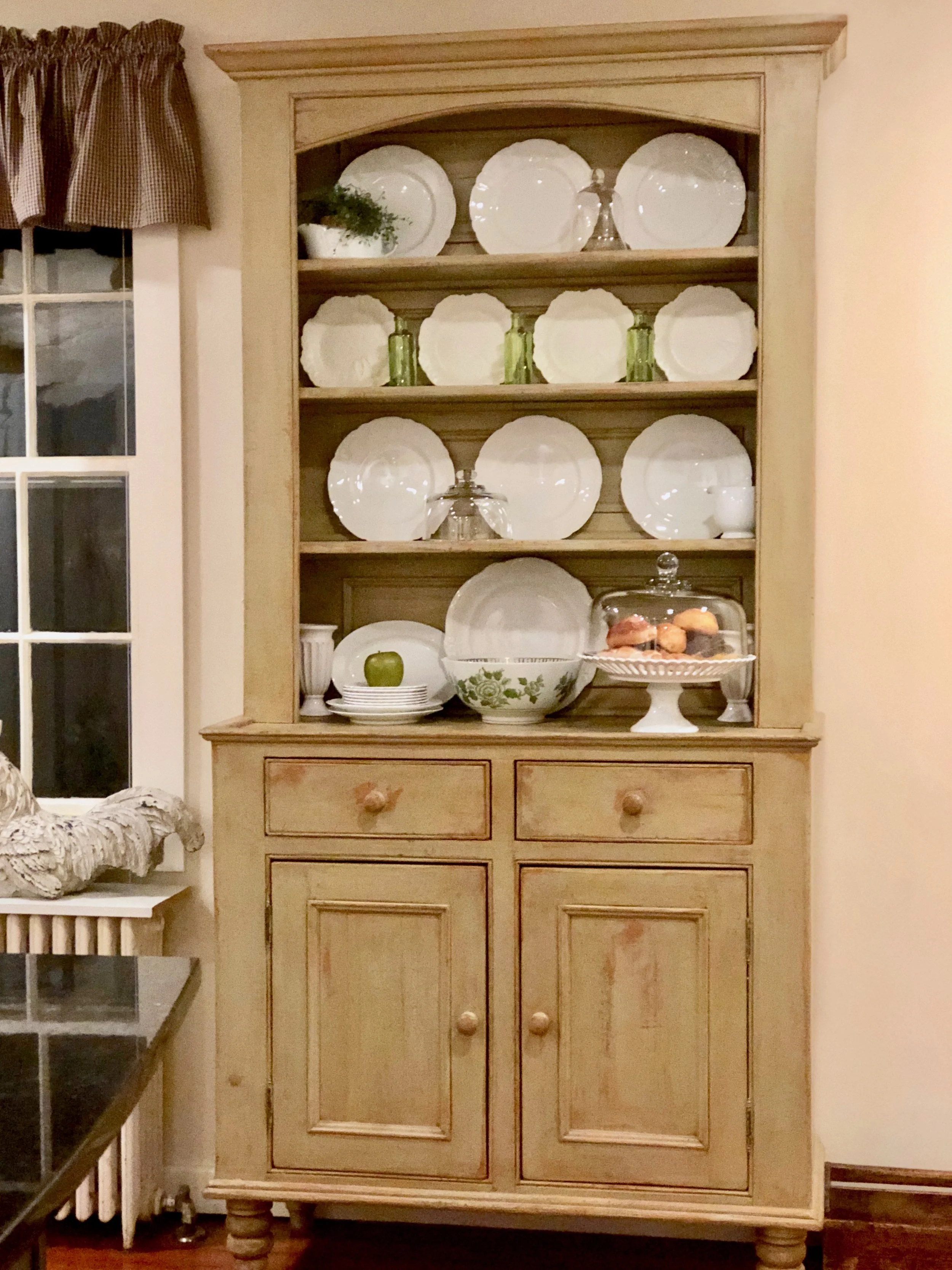 Other than the plant, the above photo is before I started to add a few pops of green to the kitchen hutch display.
