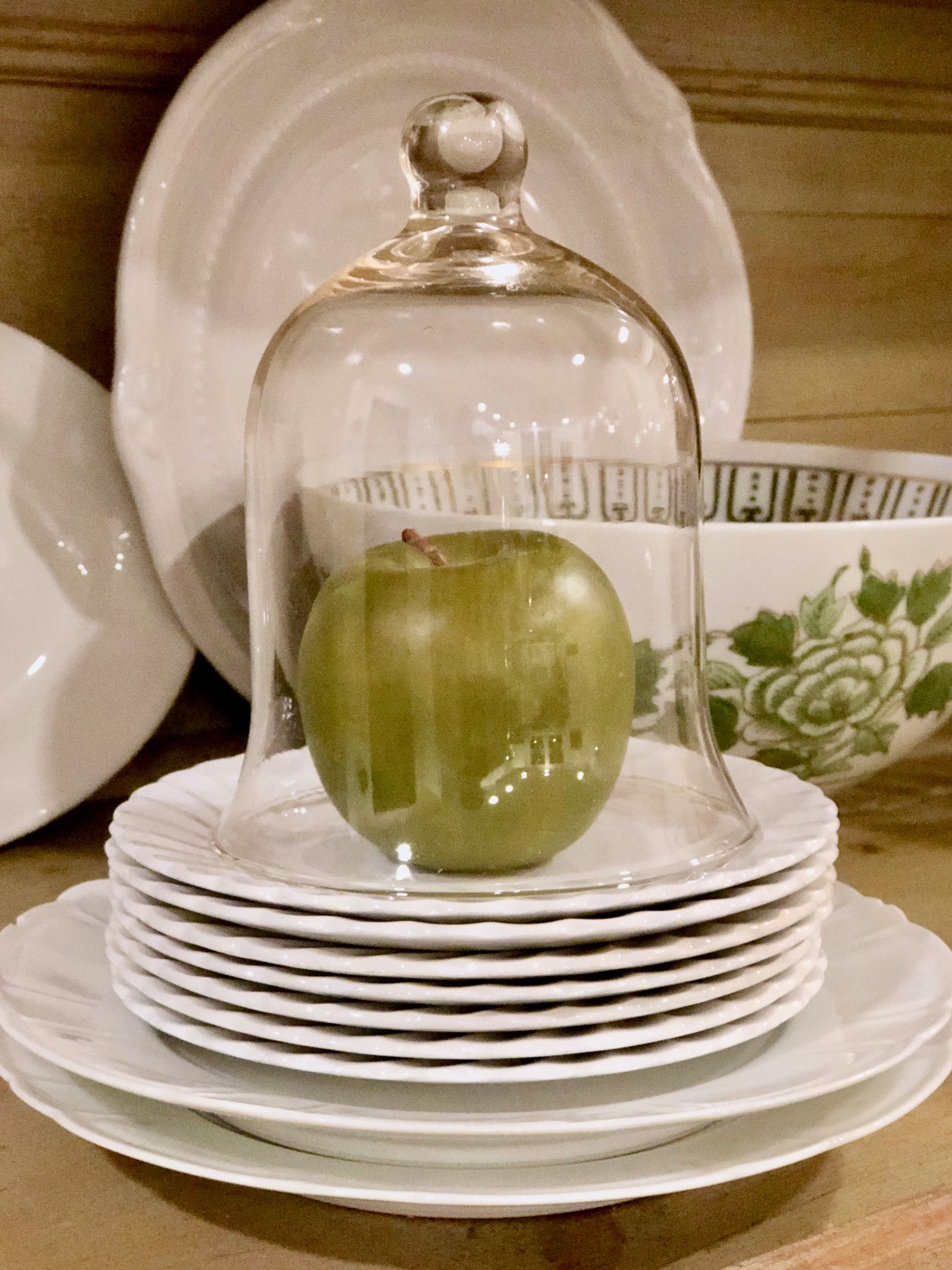 A set of white Ironstone plates sit atop two Limoges plates and I think their patterns work together perfectly!. The mini cloche covering the faux apple, is actually part of a hanging candle holder from outside.