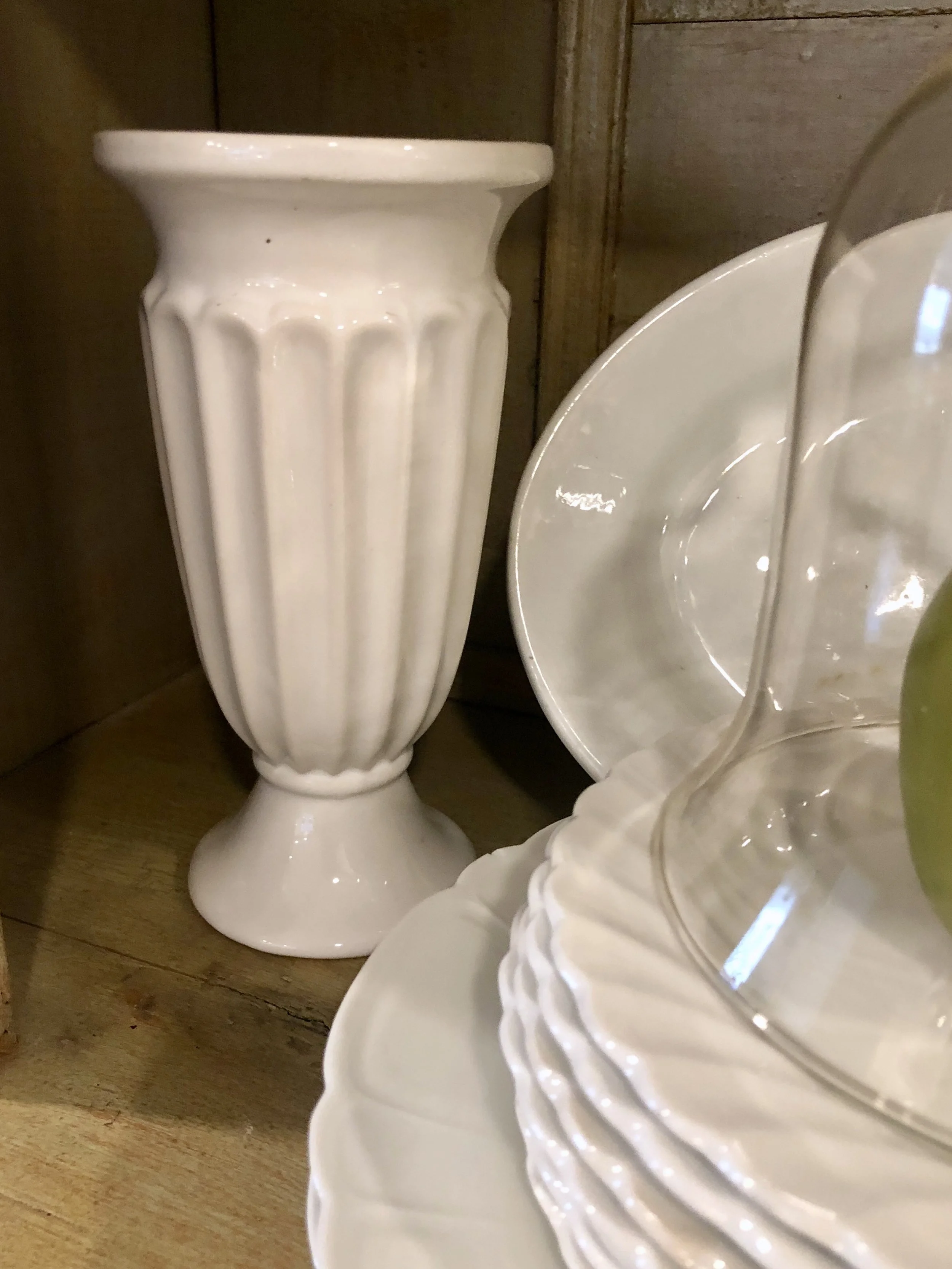 This collection was put together over time. The oval Ironstone was purchased at a thrift store over 10 years ago, the Limoges Plates ($8 for set of 8) and Ironstone plates ( $6 for set of six) were purchased at a local Savers, and the Wedgwood plates were given to me by my mother-in-law. The large dish, behind the green and white bowl, is from when I sold Southern Living products out of my store.
