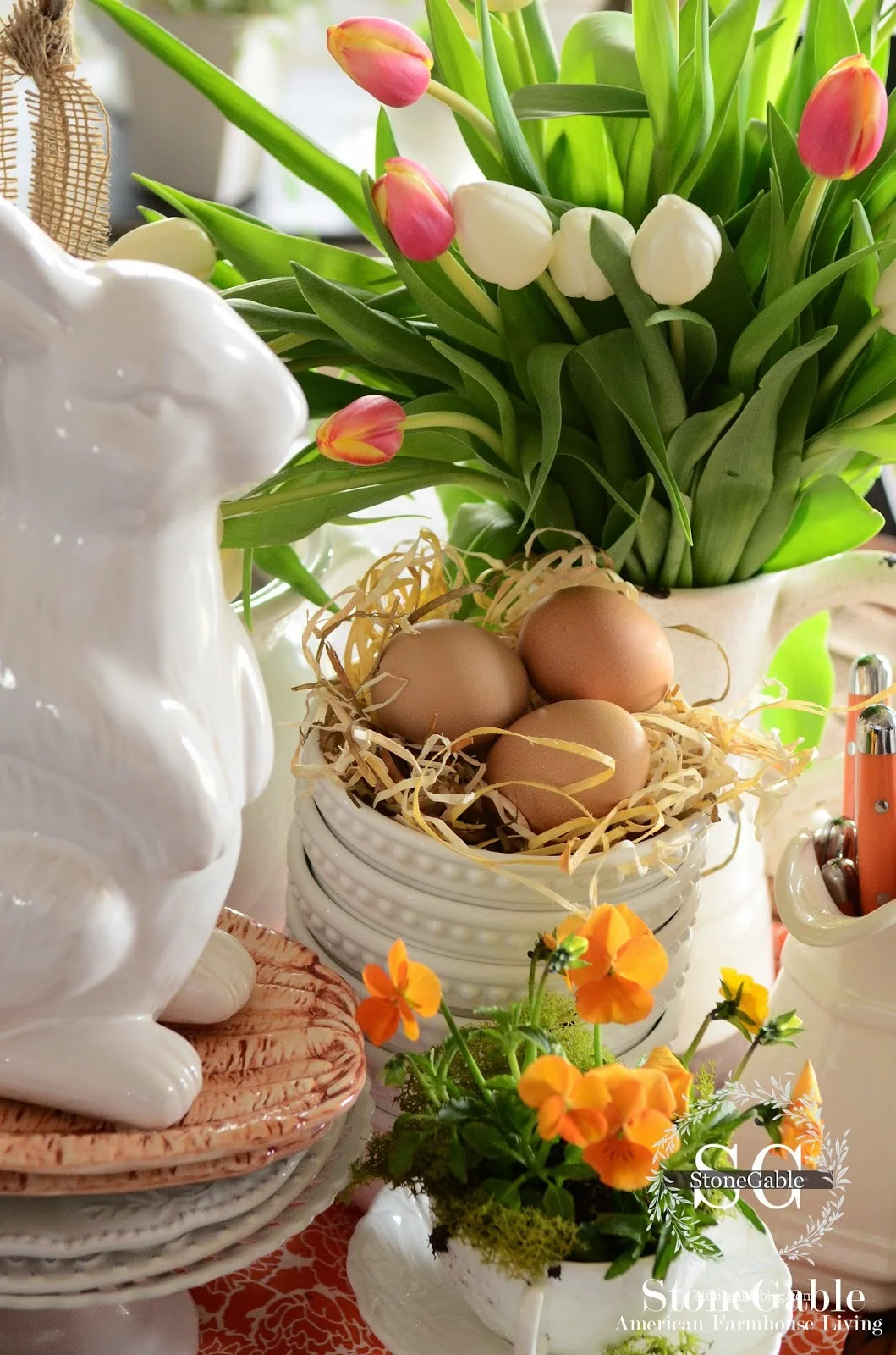 Who needs carrots when you can use orange flowers? The pop of orange really sets off this Easter table by Stone Gable.