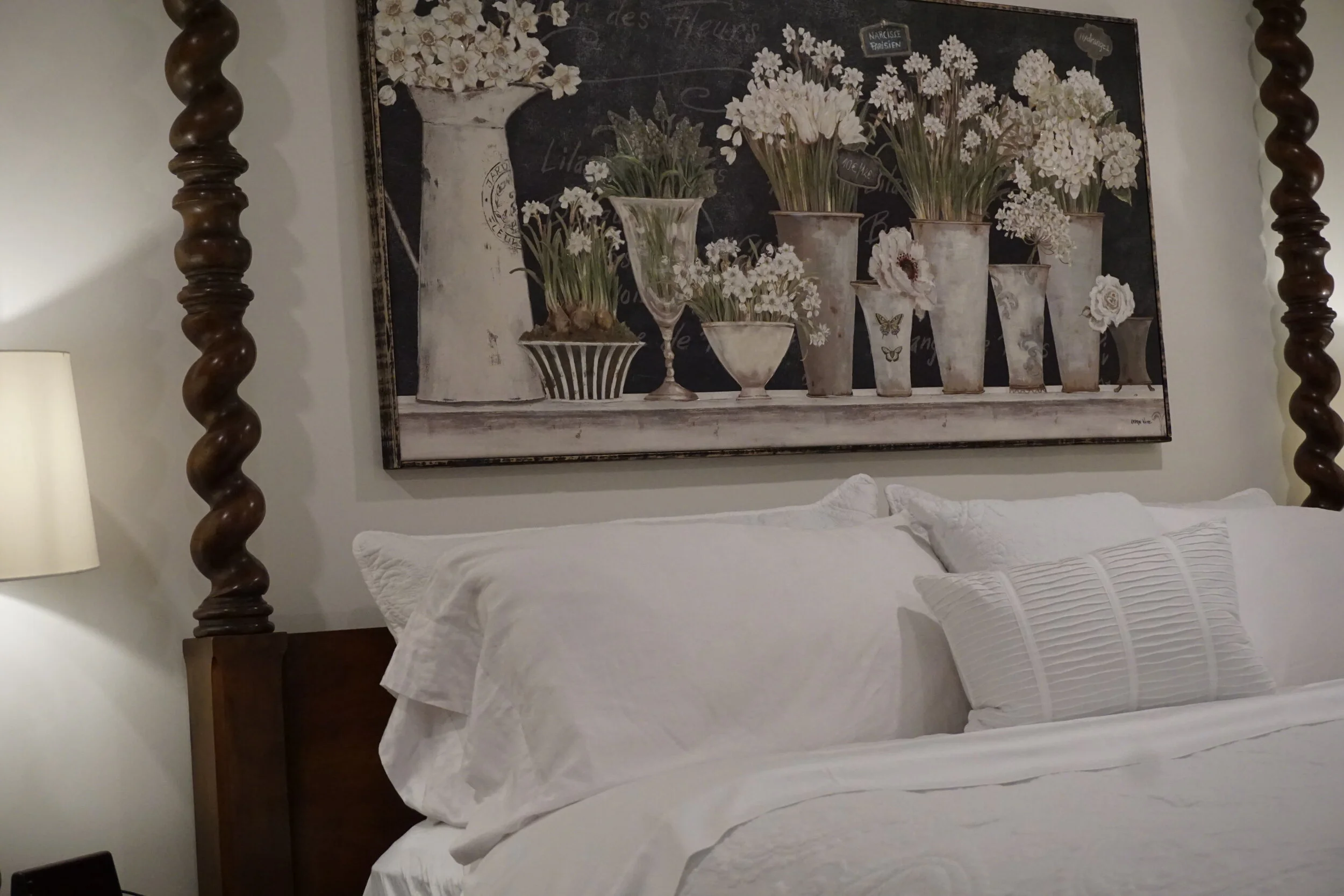 Once in our home, I found that it only fit on three walls in our home due to windows and doors in our small rooms. It may end up in my kitchen, but for now it is being used in our new master bedroom as my inspiration piece for colors I want to bring into our space since I find them calming.