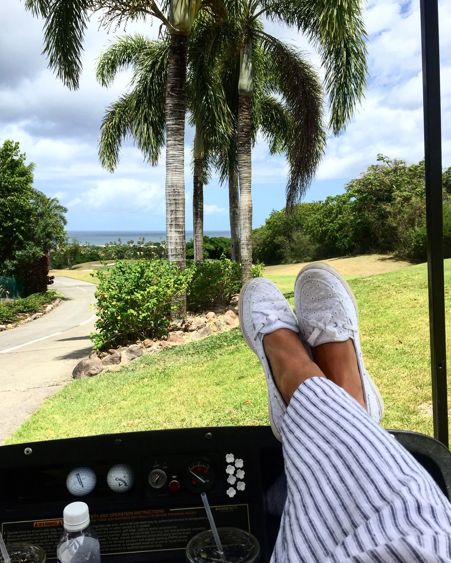 Below is a picture from our honeymoon at the Four Seasons on Nevis This was before I took golf lessons and used to ride around in the cart with a good book while Ben golfed. You can see the very slight difference with this Winhdam slip-on.