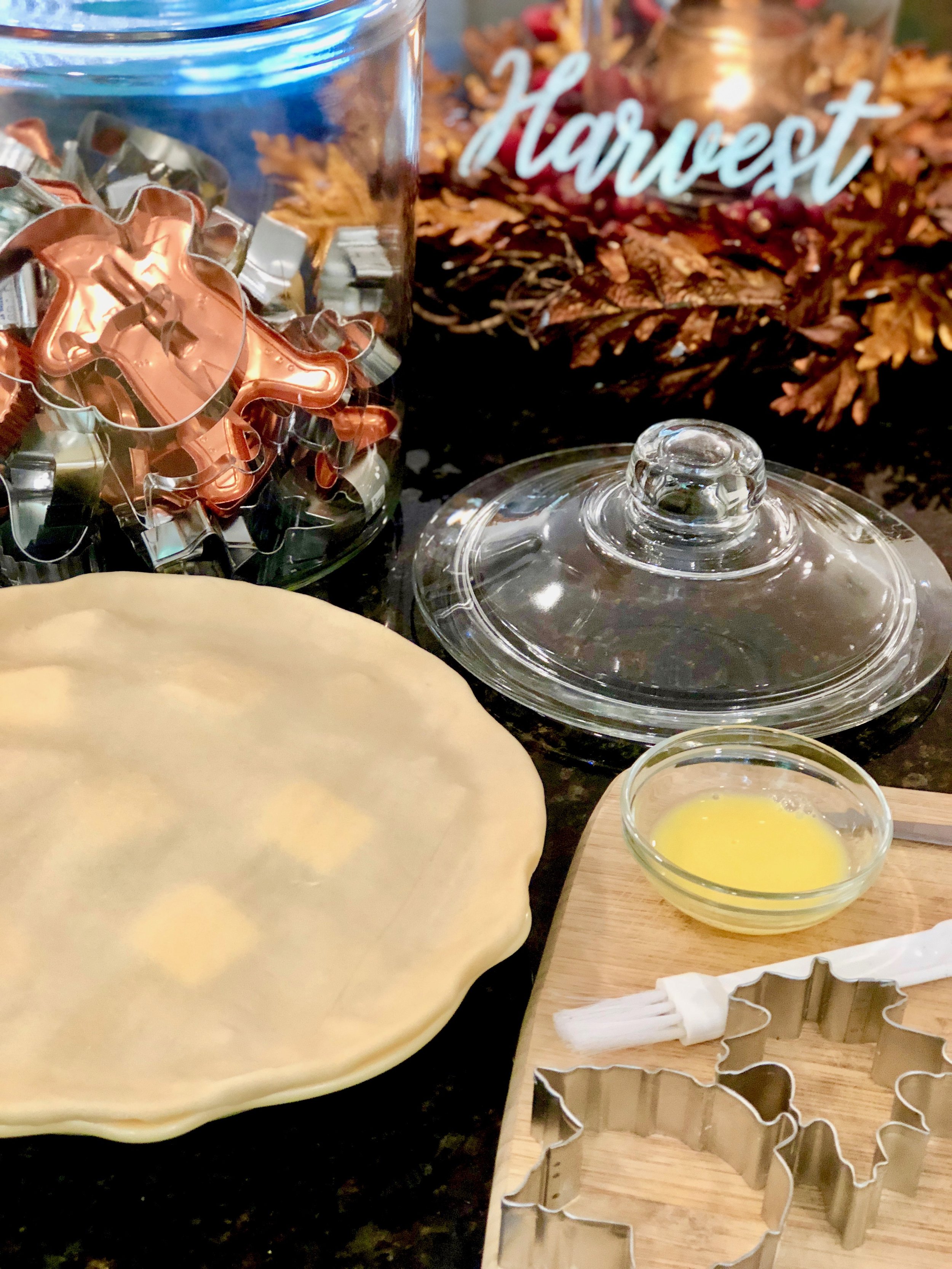 Once your leaves are on, lightly brush the top of the pie with egg wash. If you would like, you can score some leaf veins into the pie crust to make them look a bit more realistic. I could have been a bit more precise, but my Mr. was being very patient waiting for our pie to be put in the oven.