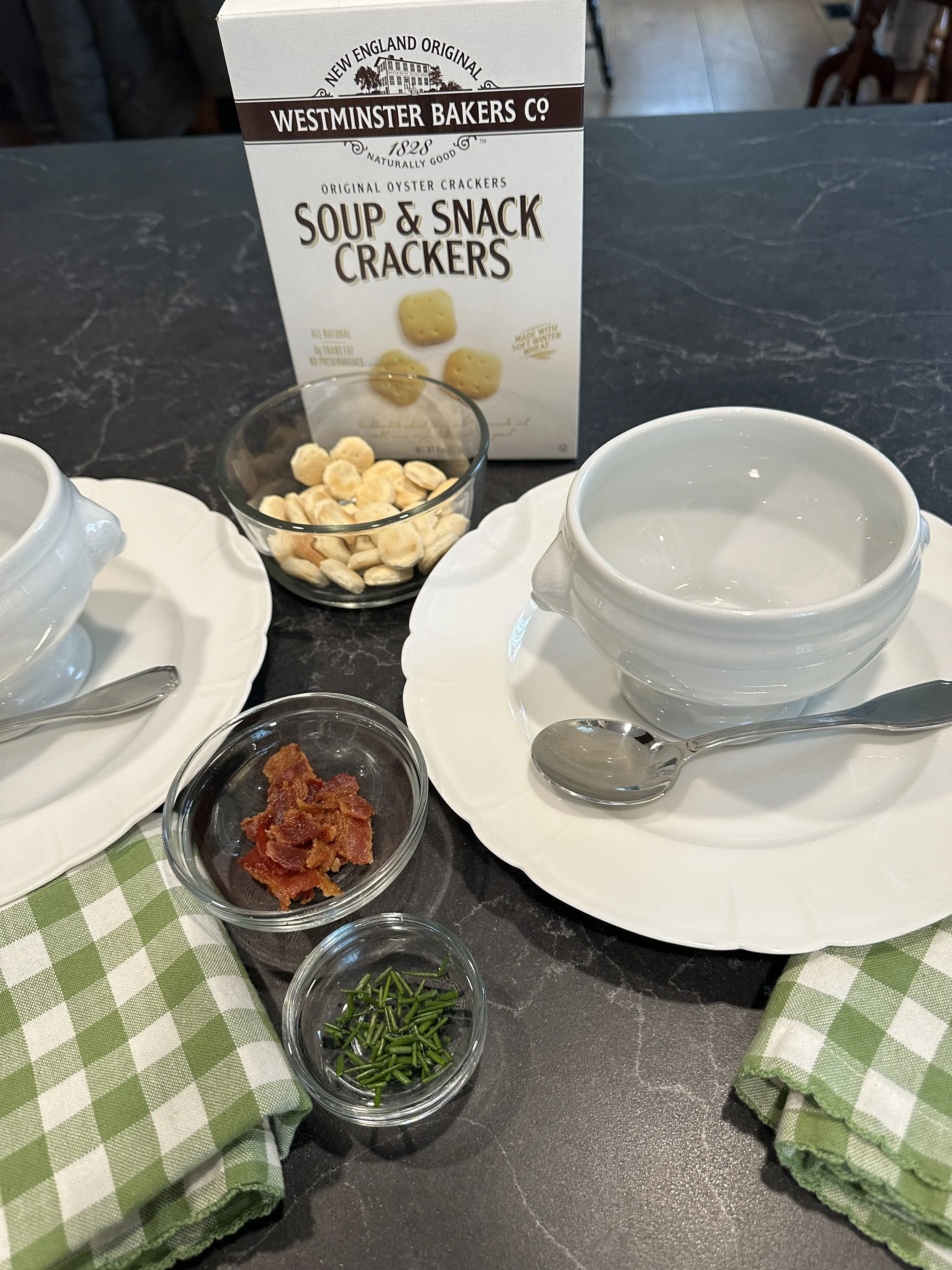 I bake my bacon in the oven at 350 until crisp, but you could also cut it into pieces and sauté in a dutch oven or the pot that you will be using to cook the chowder.