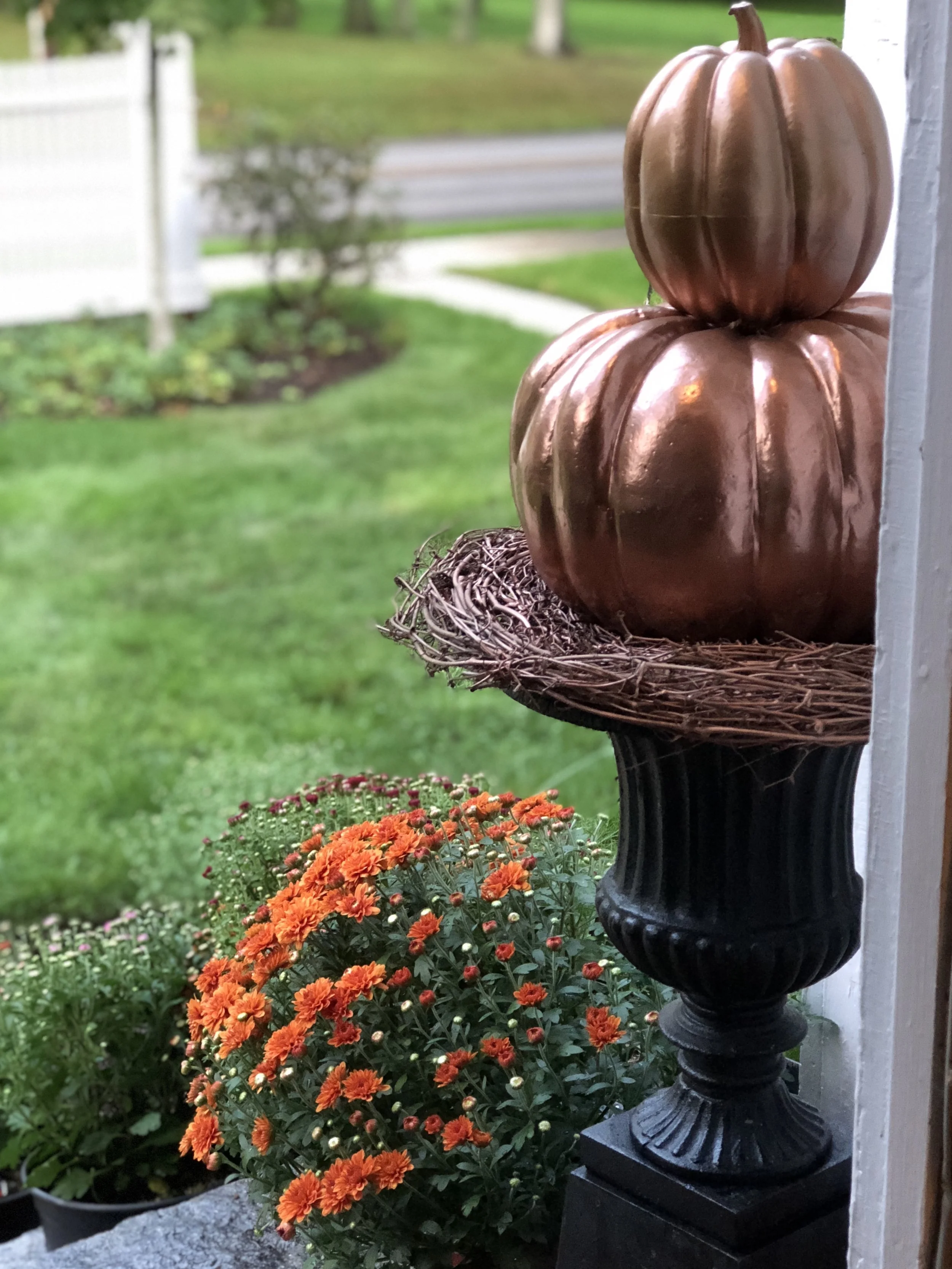 Well I finally got myself out the door to purchase some mums for our new house. I am certainly having fun seasonally decorating this home for the first time and seeing what works and what doesn't. For instance, the urns, and the faux pumpkins I spray painted, were from our previous home. I had one additional layer of pumpkins at the other home, but I felt the additional large pumpkin overwhelmed the portico. You can see my urns from last year (you can see that listed under fall) along with a DIY tutorial on making an oak leaf garland.