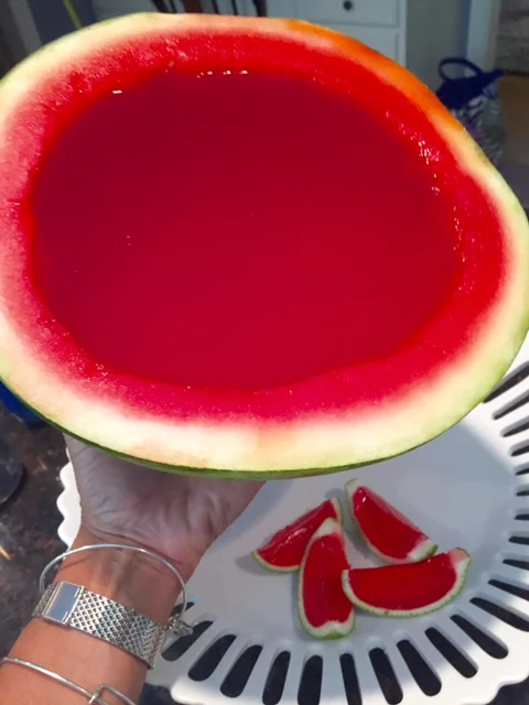 Since we had extra Jello from the Jello shot recipe, we filled halved limes then cut them to look like mini watermelon slices. As noted below, watermelon jello is more pink than red, so we did make this Jello shot recipe with strawberry.