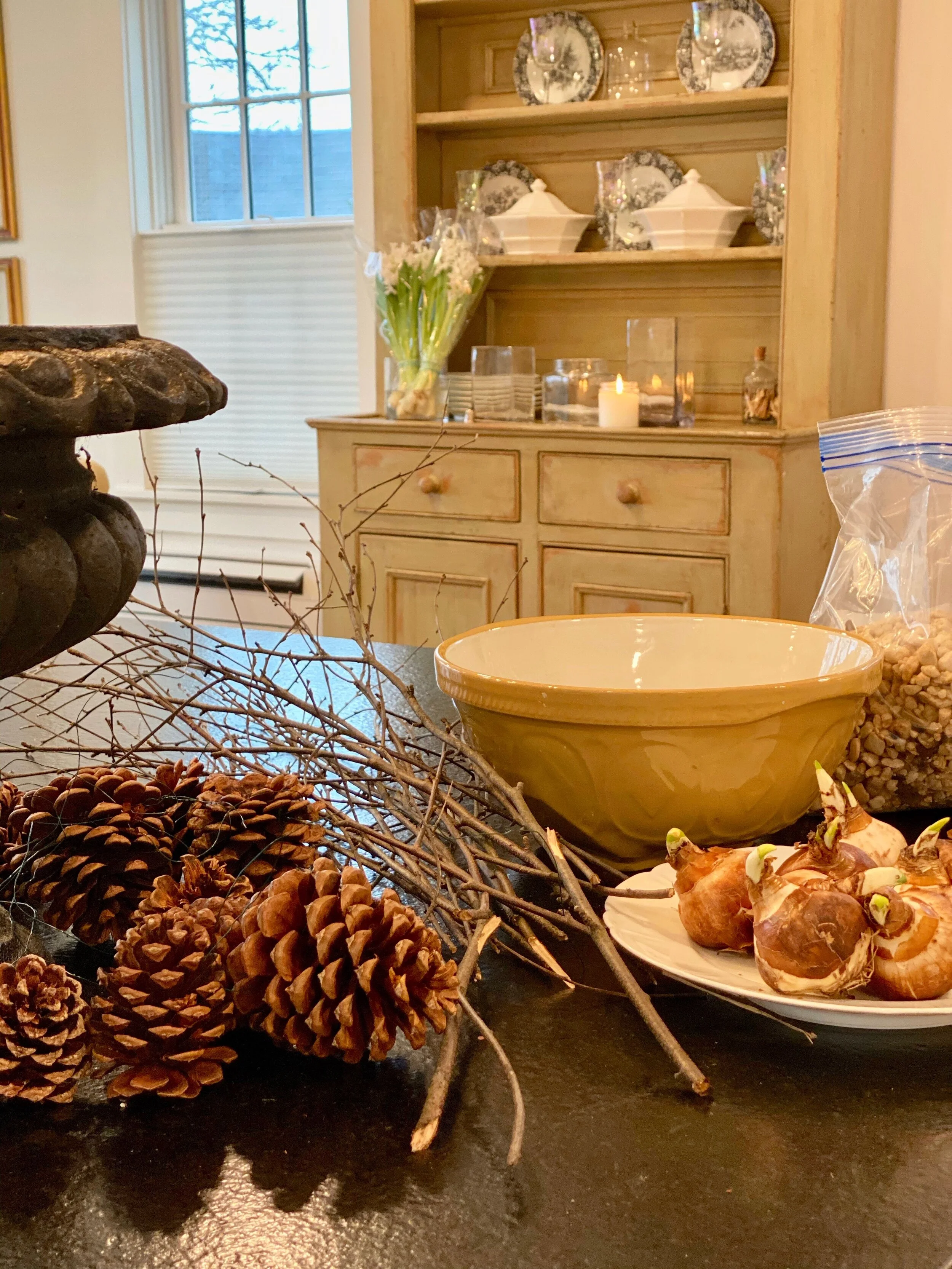 This winter, I decided to plant the paperwhites with twigs from the yard and a few pine cones I had just taken off one of our Christmas wreaths (the wreath I made with faux fruit, shown in a past video https://youtu.be/WcdzIoO37hk )